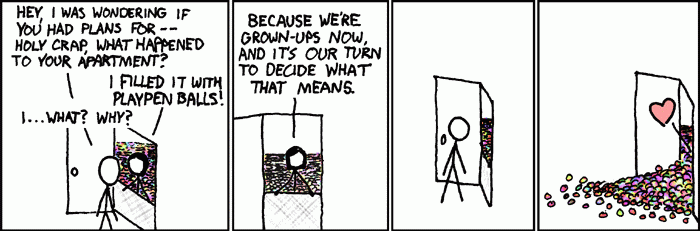 From the wonderful comic XKCD.  Yep, I'm the grown-up now and I get to decide what that means.  Mostly it means having fun.  I'm doing my best to fill my life with playpen balls. These pages reflect that fun. My hope is that you can gain some benefit from my work and experiments, or at least some entertainment.  If not, well, the experience cost you only time.