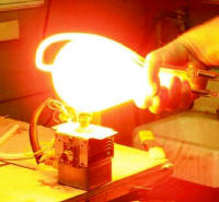 The photo above is of a neon filled globe being illuminated by the radiation from a 600 watt microwave magnetron. The magnetron makes a nice hand warmer. The funny fringes in the image are caused by the microwave radiation affecting the digital camera.