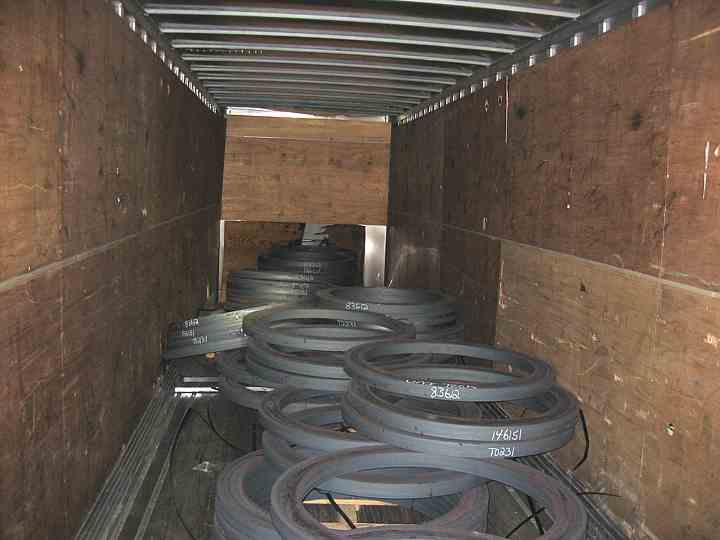 What happens when you combine 20 tons of loose steel in a box van (instead of a flatbed) and a ditzy Atlanta driver with a cellphone to her ear who just passed on the right, then cut in front and laid on the brakes. Yep, some of those 500 lb rings are touching the tractor gangway. | ||||||||||||||||||