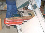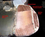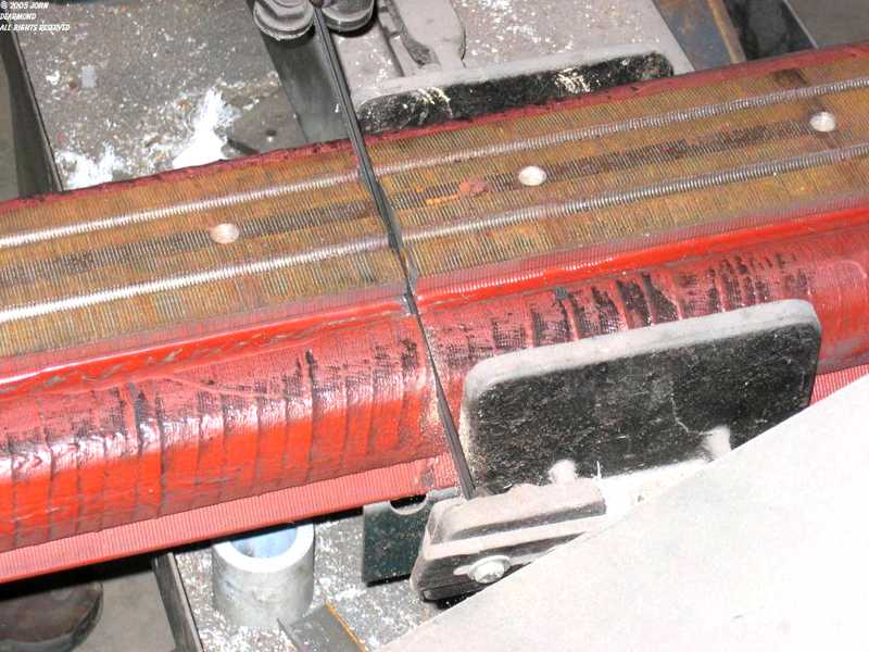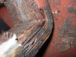 | A closeup of the cut. This photo shows the construction of the field. The vertical laminations are in the center with both the series and shunt fields inside the orange tape. |
