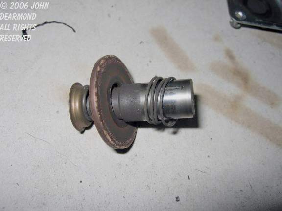 This photo shows the solenoid with the lid removed. Note the generally overheated and worn look. Also note how the plunger is sitting at an angle much deeper than it should. | |||||||