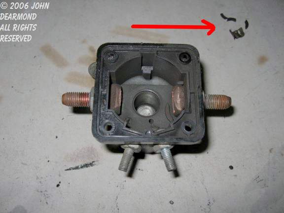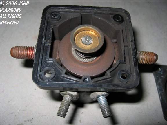 This is the solenoid with the plunger and contact ring removed. When the solenoid is energized, the plunger pulls down a copper ring that makes contact with the stud on each side. Not very robust. | |||||||