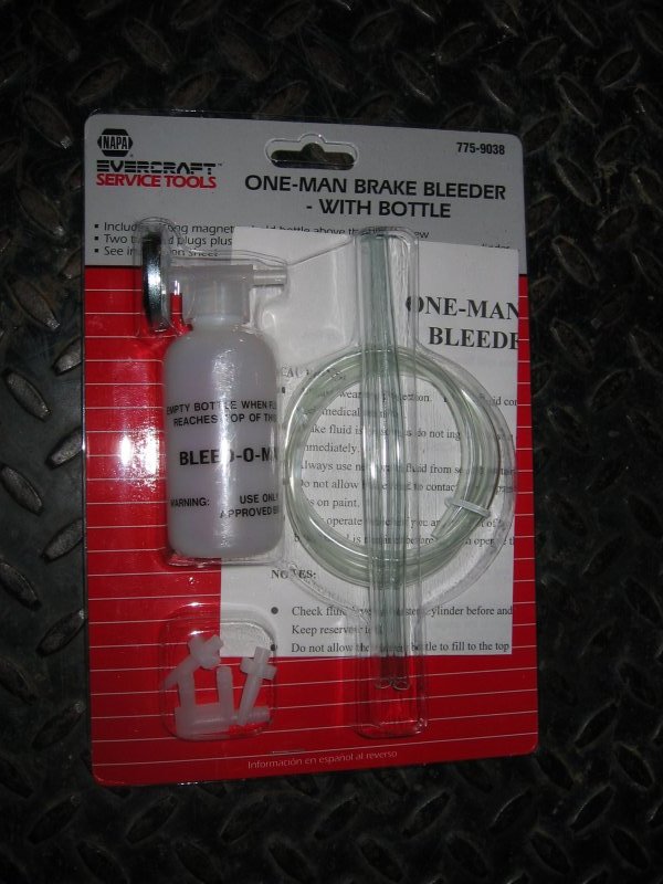 Step 1: Get a "one man bleeder" kit like the one pictured to the right. This kit costs under $10 and makes bleeding trivially simple. Follow the enclosed instructions for connecting it to the bleeder plug. |