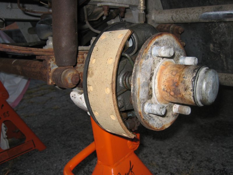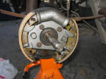 Step 1: Remove the wheel and drum. Back off the adjuster if necessary to let the drum release. The adjuster is a toothed wheel (see below) that can be turned with a screwdriver after removing the rubber access plug. The drum may be stuck to the axle if the assembly is rusted. DO NOT try to pry between the backing plate and the drum! The plate is plastic and will break. First try tapping the rear of the drum with a soft face (brass) hammer. If that fails then a 3 jaw gear puller can be carefully used. Do not force things, as the drum is easily warped and replacements are hard to come by. Heating the hub around the studs might also help. If all else fails, pop the grease cap, remove the bearing retainer nut and remove the hub and drum as an assembly. |