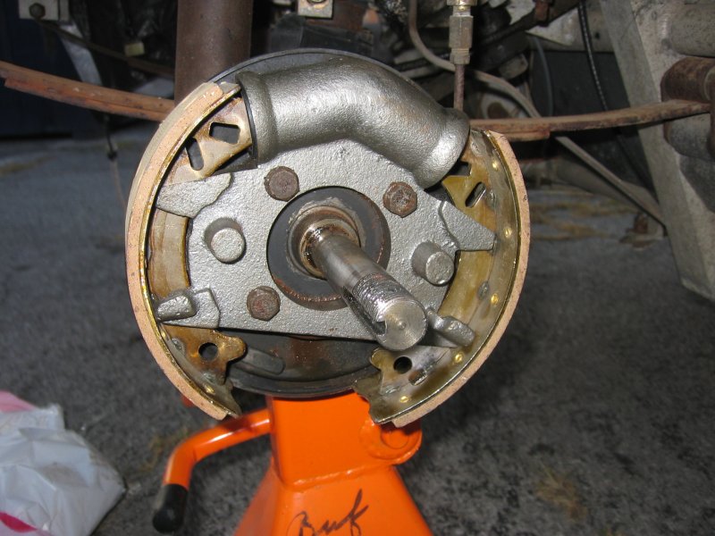 Step 8: If the pedal travels more than about 3/4" before the brakes apply, adjust the shoes as before. This is usually necessary, as the shoes quickly wear in to fit the drum. Top off the master cylinder if necessary. You are now finished. |