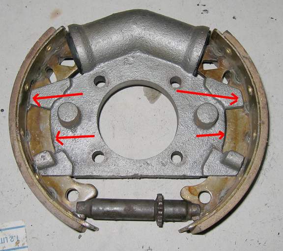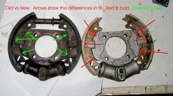 This photo shows the old spider on the left vs the new spider on the right. Note the various arrows. Note how sloppy the radius where the shoes mate is. Note how the guide prongs hold the shoes off the seating radius. Note the general sloppiness. | |||||||