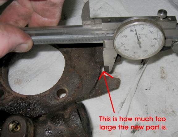 This photo shows how much discrepancy there is in size between the old and new spiders. The caliper has been set to the radius of the new part. As is evident, it is way too large. | |||||||