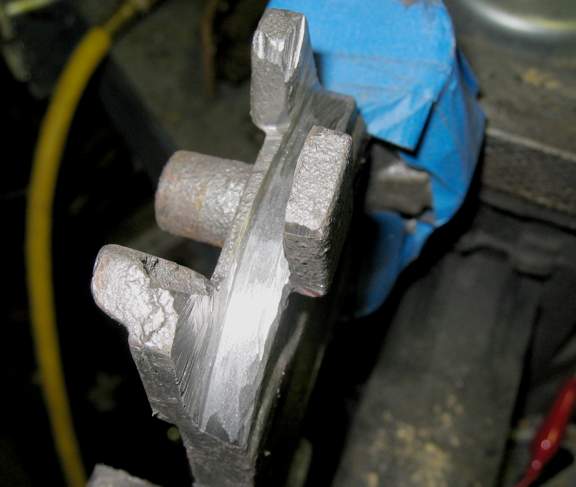 The most important thing I've learned is that the indian-made spiders are junk. Apparently tolerance and finish and finish are new concepts to the indians. The lack of finish or control of dimensions resulted in one wheel that would lock up solid whenever any amount of brake pressure was applied. It would stay locked up until the vehicle was allowed to roll backward. After taking the wheel and brake drum off several times, I decided to pull the whole brake assembly off, take it back to the shop and look things over in an orderly manner. One thing quickly became evident - again - and that is, NEVER THROW AWAY OLD PARTS. At least until you're absolutely positively sure that the new parts work OK. The basic problem I found was that the critical shoe back-seating radius on the spider AND the length of the guide tangs were so far off that the shoes were jacked up such that whenever brake pressure was applied, the shoe wedged between the drum and the cylinder and locked the wheel. The solution was to machine the spider to more suitable dimensions. The old OEM spider provided known-good dimensions. Ideally the spider would be chucked up in a lathe and the important radii turned to perfection. Lacking such luxuries, I substituted the next best thing - an angle grinder, a wheel of suitable width and a stable hand. |