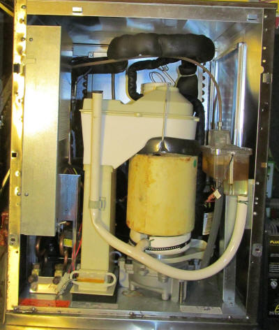 A photo of the inside of the machine showing how clean it is. The condenser is barely visible in the rear and is spotless. Also notice the white oblong drip pan under the yellow pelletizer. With this type of machine, as the auger seal begins to wear, water drips into this pan and is carried away. This pan has never been even moist. |