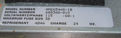 The nameplate. They recommend a 30 amp fuse but I run the machine on an ordinary 20 amp branch with no problems. To the best of my recollection, the current draw is about 16 amps. This unit uses 1270 KWh per month (about $27 per month at our power rate) when operated 24 hours a day. This is the actual measured consumption using a watt-hour meter with the machine located in an 80 deg room. |