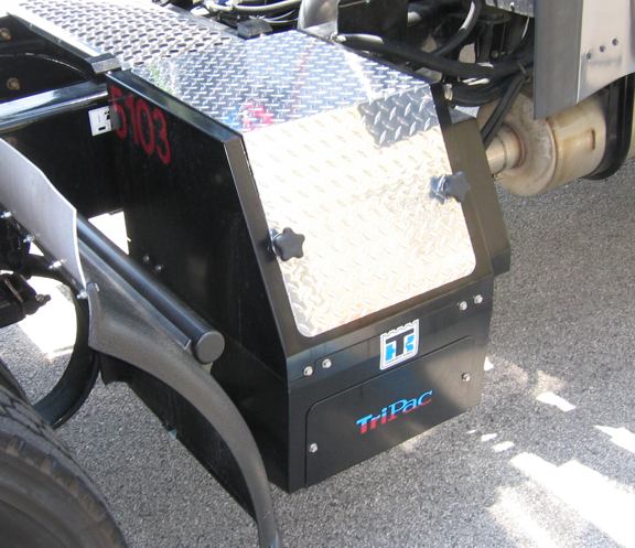some states are making it illegal to idle for more than a few minutes. This is an example of an APU mounted to a Kenworth chassis. Inside is a small low speed diesel engine, an air conditioning compressor, a 12 volt alternator and optionally, a 120vac alternator. The engine is water-cooled and so can supply comfort and engine block heat in the winter. The fan in the photo is used to cool the engine in the summer when the heat isn't needed elsewhere. |