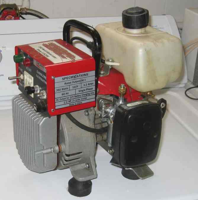 It is quiet and just sips fuel. A three phase permanent magnet alternator feeds the 60 hz inverter. One sets the engine speed manually via the thumb nut on the carburetor according to the load. If the load lightens and the engine over-speeds, a spark cut rev limiter cuts in. Mini-FAQ No, I don't know where to find another one. No, I don't have any spare parts. No, I don't have a manual. |