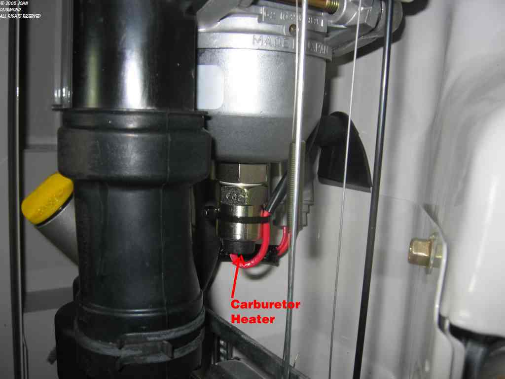 Generac has a better idea. This photo shows the electric fuel cutoff that also serves as an electric carburetor heater. It applies heat right where it is needed - the emulsion tube. This deices the carb without the power hit that warm air causes. | |||||||