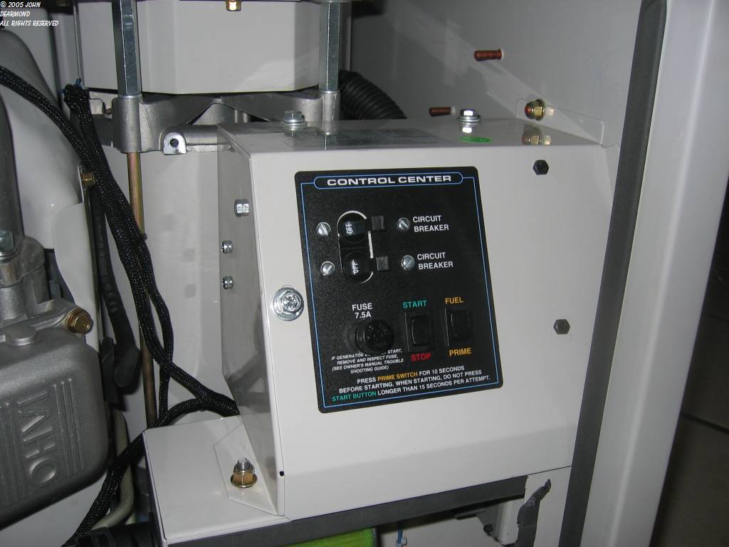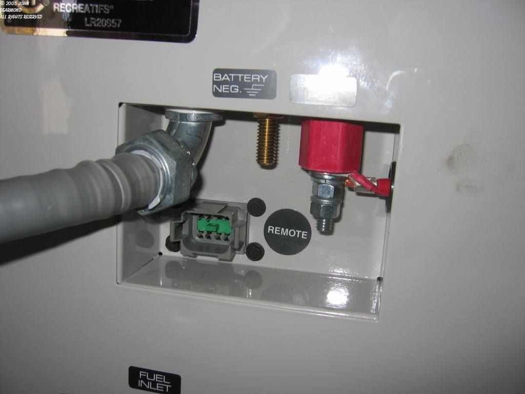 | Here is where all the outside connections are made. Note the waterproof automotive-type connector for the remote controls. If you've ever fought to get heavy cables bent around to make the connections to an Onan, you'll really appreciate this battery connection. |