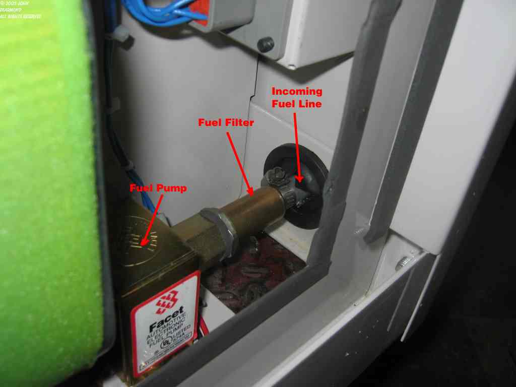| Here is a view of the fuel system. The fuel hose is simply pushed through the grommet, slipped over the fuel filter nipple and the clamp tightened. Note the superb Facet fuel pump. Very quiet and efficient. |