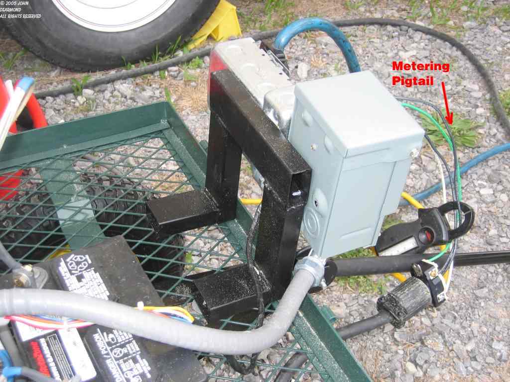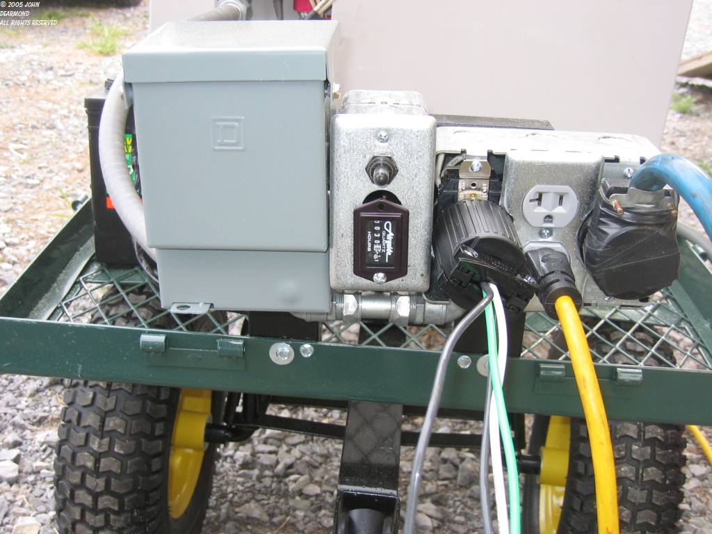 | The generator cart is pictured above left. This is a shot of the electrical connections. I bypassed the internal breakers and installed an external breaker so that I don't have to remove the service panel to reset the breakers. |