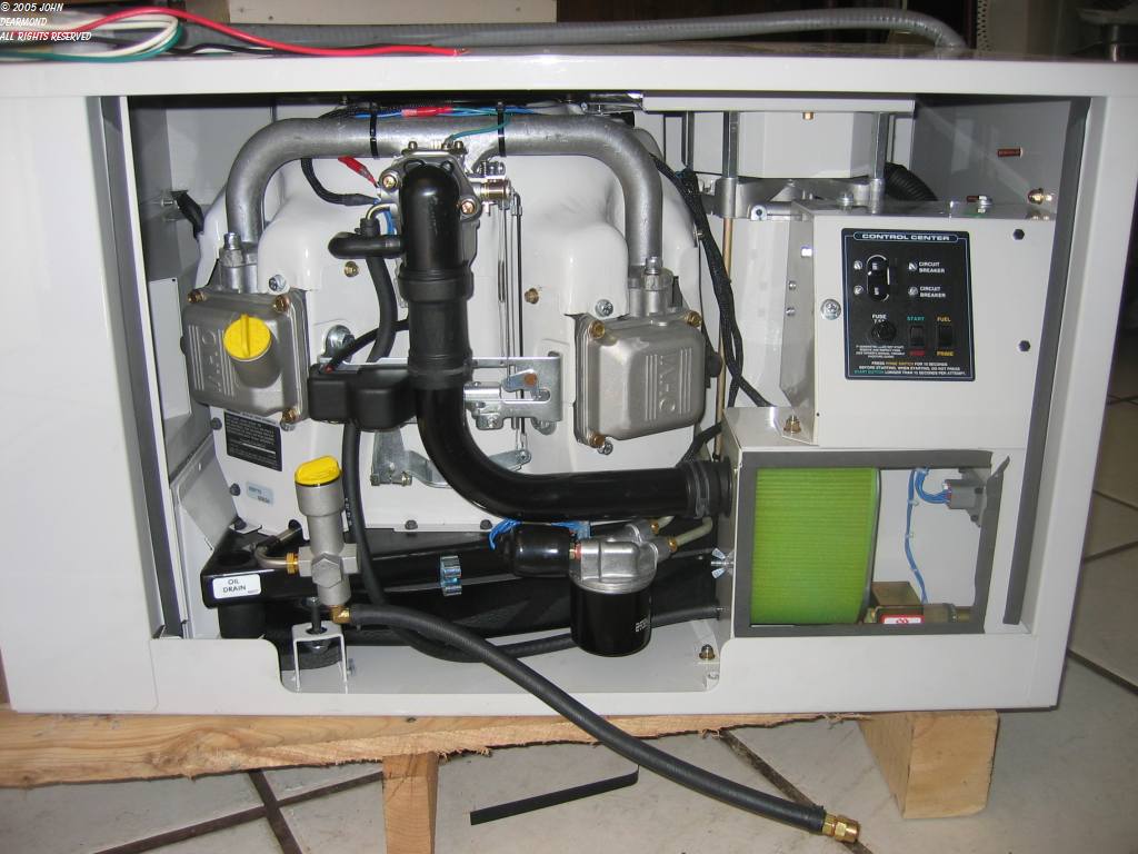 | This photo shows the generator as it arrived. The service panel is off. The V-twin engine is to the left. Note that it is completely enclosed in sound damping metal. |