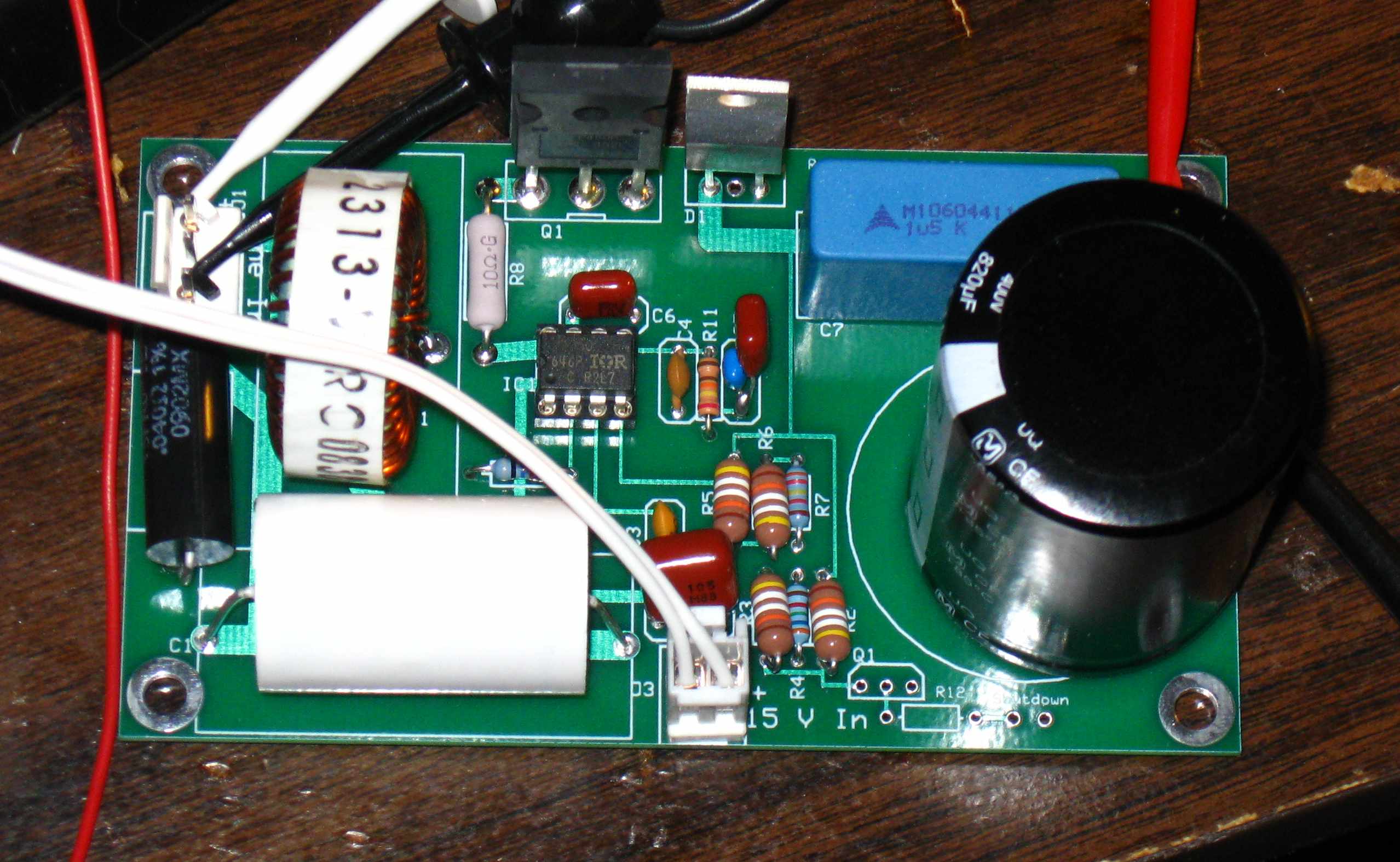 Another closeup of the board showing how I hacked in the voltage adjustment pot on the prototype board, and also showing more details. The pots are integrated in the production board that we sell. There are spaces for two pots on the board. Since you'll porbably not be switching voltages, simply don't populate one space. |