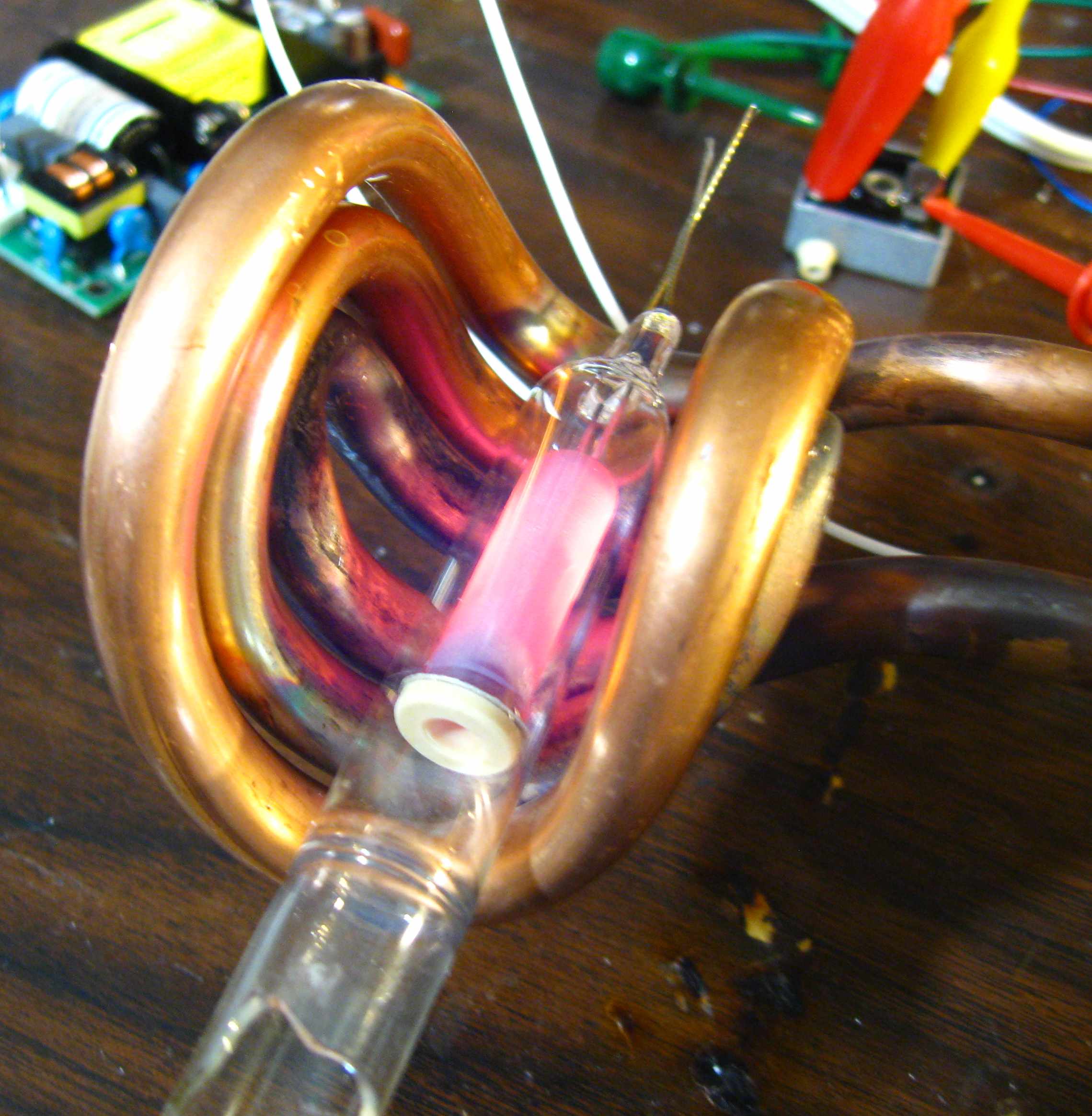 Here's what the neon folks have been waiting for. A 15mm electrode being heated in a C-coil. With this type of coil, it can simply be held up to the electrode instead of having to be mounted around it before processing. Note that we're still working on making pretty C-coils. This one is functional but it ain't pretty :-)