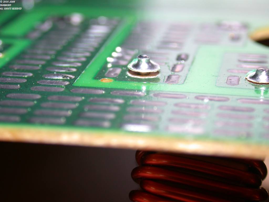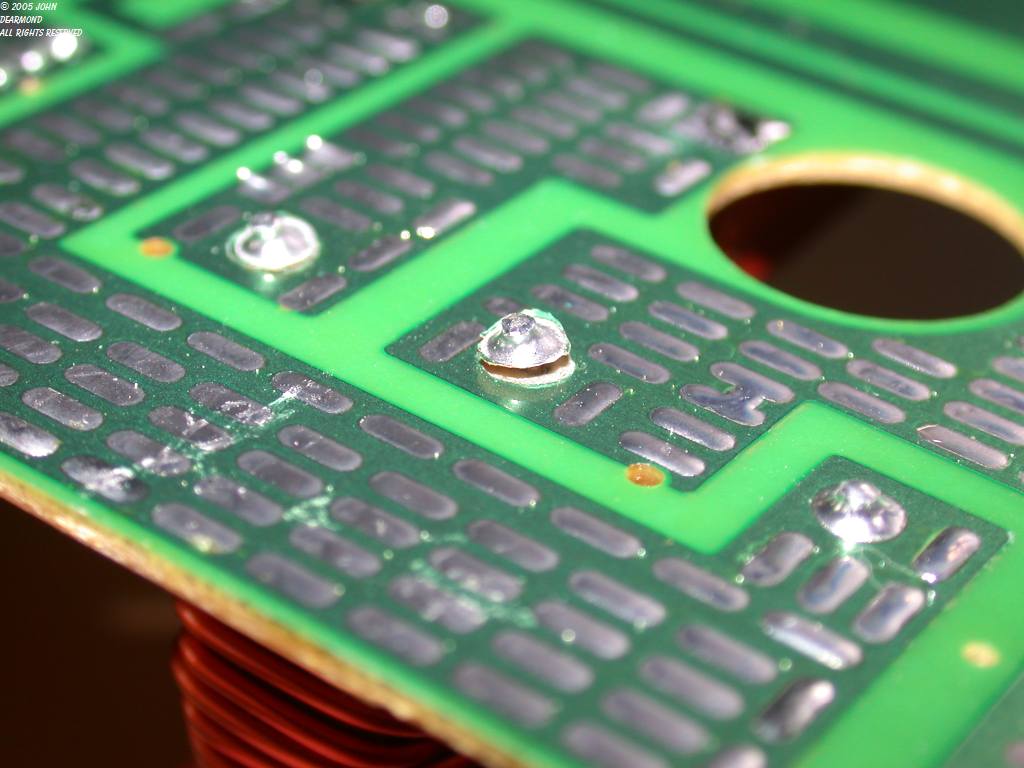 Why the units were non-functional. This is the back side of the board where those torodial coils rest. The coils were supposed to be secured to the PCB with squirts of glue but the machine apparently misfired. The heavy inductors were left to flop in the air and shipping jolts broke the solder pads. Trivially easy to fix. |