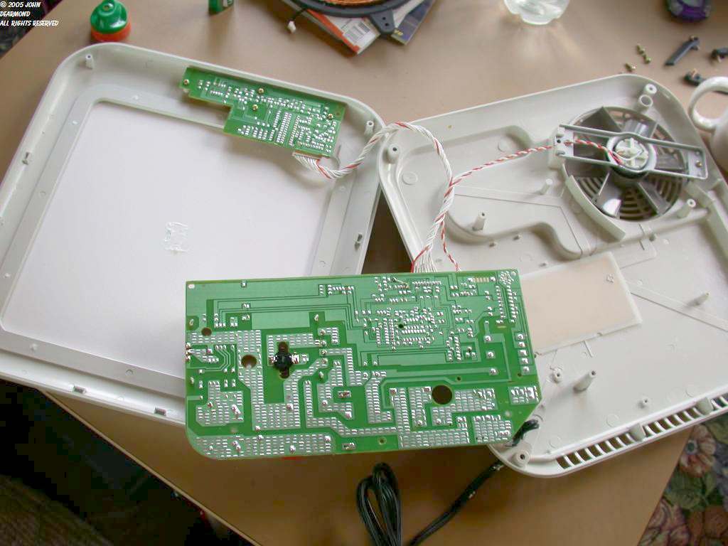 The guts splayed out. The bottom of the board uses a clever array of solder bumps to increase the current carrying capacity of the copper foil. The black thing at center left is another thermostat to protect the electronics from overheating. |