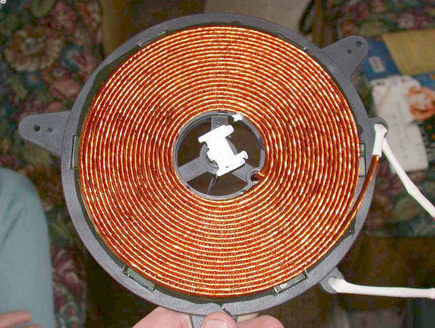 Here is the work coil. It is a helical coil wound with Litz wire. The black plastic looking stuff is the ferrite magnetic field focusing core. It's solid under the coil so that the field projects upward. The white thing in the center is a thermostat that rests in contact with the ceramic top. It shuts down the unit if the top overheats. |