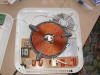 The innards. The round orange coil in the center is the induction coil that projects a magnetic field up through the ceramic top and into the utensil. The circuit board and power stages are below the coil. Pay attention to the upright toroidial (orangish) coil at the lower left of the PCB. |