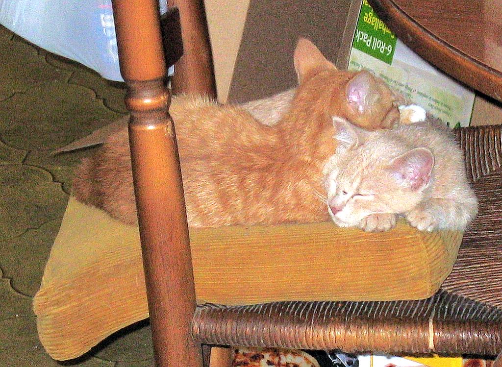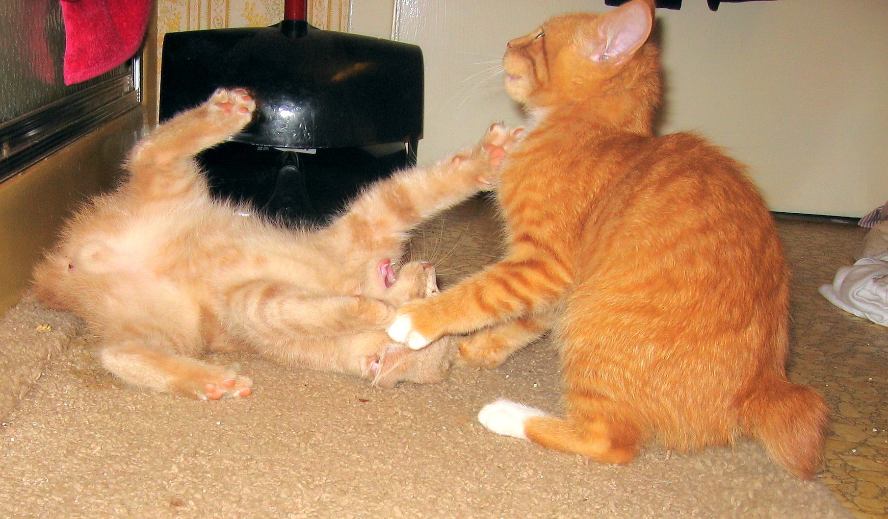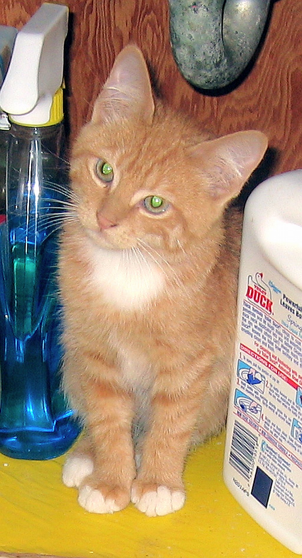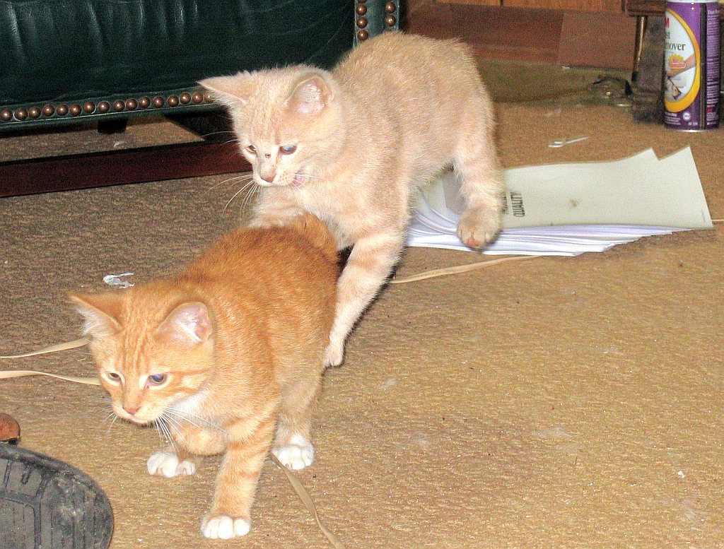 Again, love at first sight. That extra week in the wild really made a difference. When I picked Fred up for the first time, he hissed once and then started purring. When I picked Jake up, he went CATatonic! I carried him home in the live trap. I eased him out of the trap but as soon as he cleared metal, he went crazy again. Into the kitchen closet he went. I got some welding gloves and fished him out. He clamped down on my finger. Those baby teeth are sharp! I felt the prick through the gloves. Off he went again, this time behind the washing machine. Those bonds of love and affection were NOT forming. I left him alone for the evening. Next morning he was still back there. I chased him out with a broom. Into my bedroom. We played tag-under-the-bed for awhile and then I left him alone again. That night he rewarded me by taking a dump under the bed! War was about to break out. The next day I baited him out with Spam (the meaty kind) and petted him for the first time. No luck picking him up. I did get him chased out of the bedroom. After a couple more hiding places, he made his first mistake. He explored the bathroom. GOTCHA! I left the bathroom to get a litter box, water and food and when I returned he was gone! WTF? It's a tiny bathroom so after I verified that he hadn't climbed the drapes, I was about to think that he'd jetted between my legs when I opened the door. I looked one last time under the vanity and saw those eyes glowing! He'd managed to open the vanity door and get in there in the minute I was gone! Amazing. A day of Spam-baiting and gentle petting later, I managed to pick him up but only for a second before I felt him go tight again. It took two more full days before I could pick him up and he'd relax and purr. Freedom came yesterday evening. I had kept Fred in the bathroom to keep him company and in the process of playing they made my bathroom look like a grenade had gone off in it. I opened the door and let them out and they promptly began working on my den. They've been an absolute riot to watch. I'd kill for a tenth of that energy! Anytime things get dull, just introduce a pair of kittens into your life. As of this writing, Jake can be baited in with some Spam and he'll sit in my lap for a bit. He still charges off to his hidey-hole anytime I stand up or walk by. I'm afraid that he's going to always be a bit skittish. We'll see. Without further ado, some baby pix: