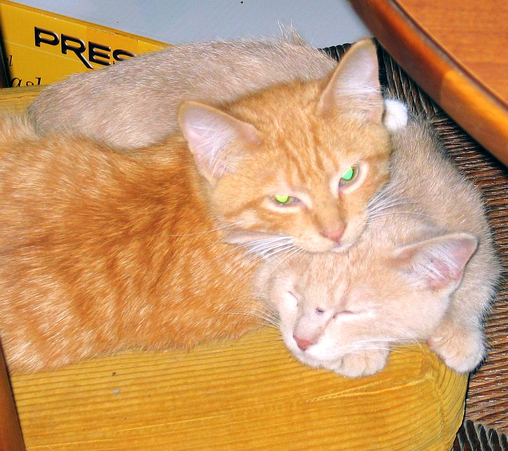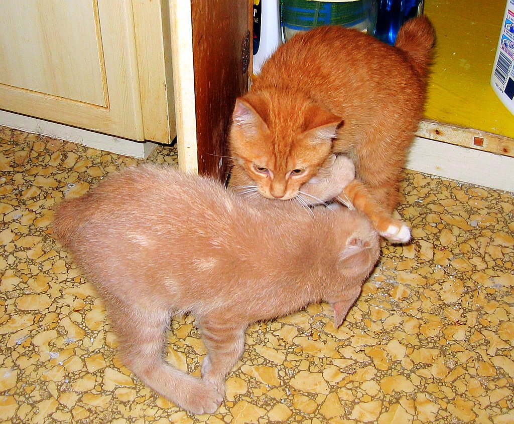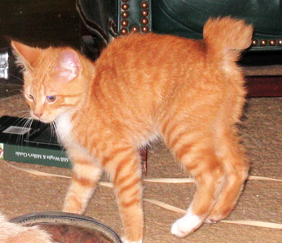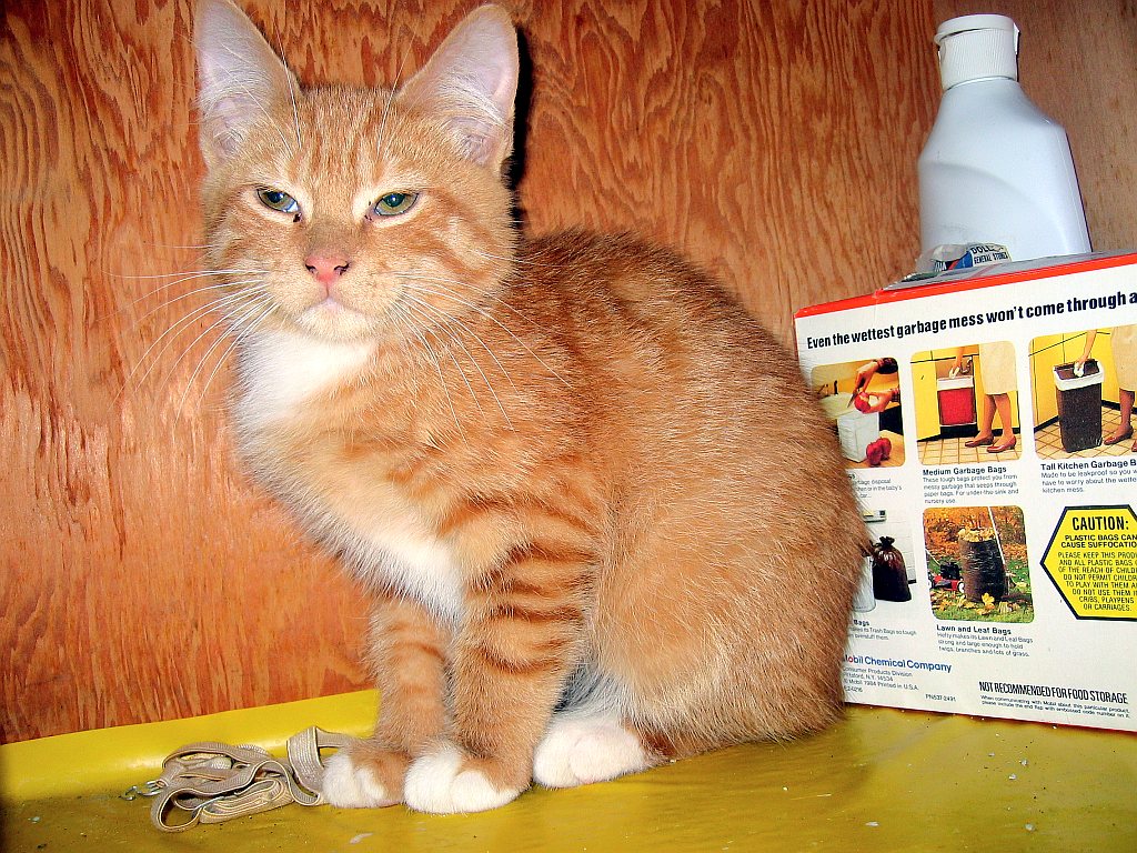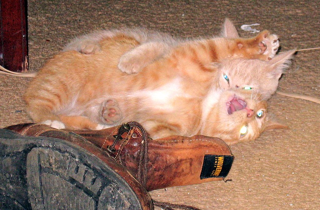 Again, love at first sight. That extra week in the wild really made a difference. When I picked Fred up for the first time, he hissed once and then started purring. When I picked Jake up, he went CATatonic! I carried him home in the live trap. I eased him out of the trap but as soon as he cleared metal, he went crazy again. Into the kitchen closet he went. I got some welding gloves and fished him out. He clamped down on my finger. Those baby teeth are sharp! I felt the prick through the gloves. Off he went again, this time behind the washing machine. Those bonds of love and affection were NOT forming. I left him alone for the evening. Next morning he was still back there. I chased him out with a broom. Into my bedroom. We played tag-under-the-bed for awhile and then I left him alone again. That night he rewarded me by taking a dump under the bed! War was about to break out. The next day I baited him out with Spam (the meaty kind) and petted him for the first time. No luck picking him up. I did get him chased out of the bedroom. After a couple more hiding places, he made his first mistake. He explored the bathroom. GOTCHA! I left the bathroom to get a litter box, water and food and when I returned he was gone! WTF? It's a tiny bathroom so after I verified that he hadn't climbed the drapes, I was about to think that he'd jetted between my legs when I opened the door. I looked one last time under the vanity and saw those eyes glowing! He'd managed to open the vanity door and get in there in the minute I was gone! Amazing. A day of Spam-baiting and gentle petting later, I managed to pick him up but only for a second before I felt him go tight again. It took two more full days before I could pick him up and he'd relax and purr. Freedom came yesterday evening. I had kept Fred in the bathroom to keep him company and in the process of playing they made my bathroom look like a grenade had gone off in it. I opened the door and let them out and they promptly began working on my den. They've been an absolute riot to watch. I'd kill for a tenth of that energy! Anytime things get dull, just introduce a pair of kittens into your life. As of this writing, Jake can be baited in with some Spam and he'll sit in my lap for a bit. He still charges off to his hidey-hole anytime I stand up or walk by. I'm afraid that he's going to always be a bit skittish. We'll see. Without further ado, some baby pix: