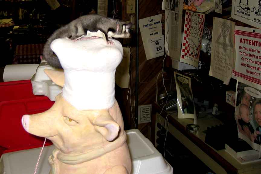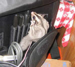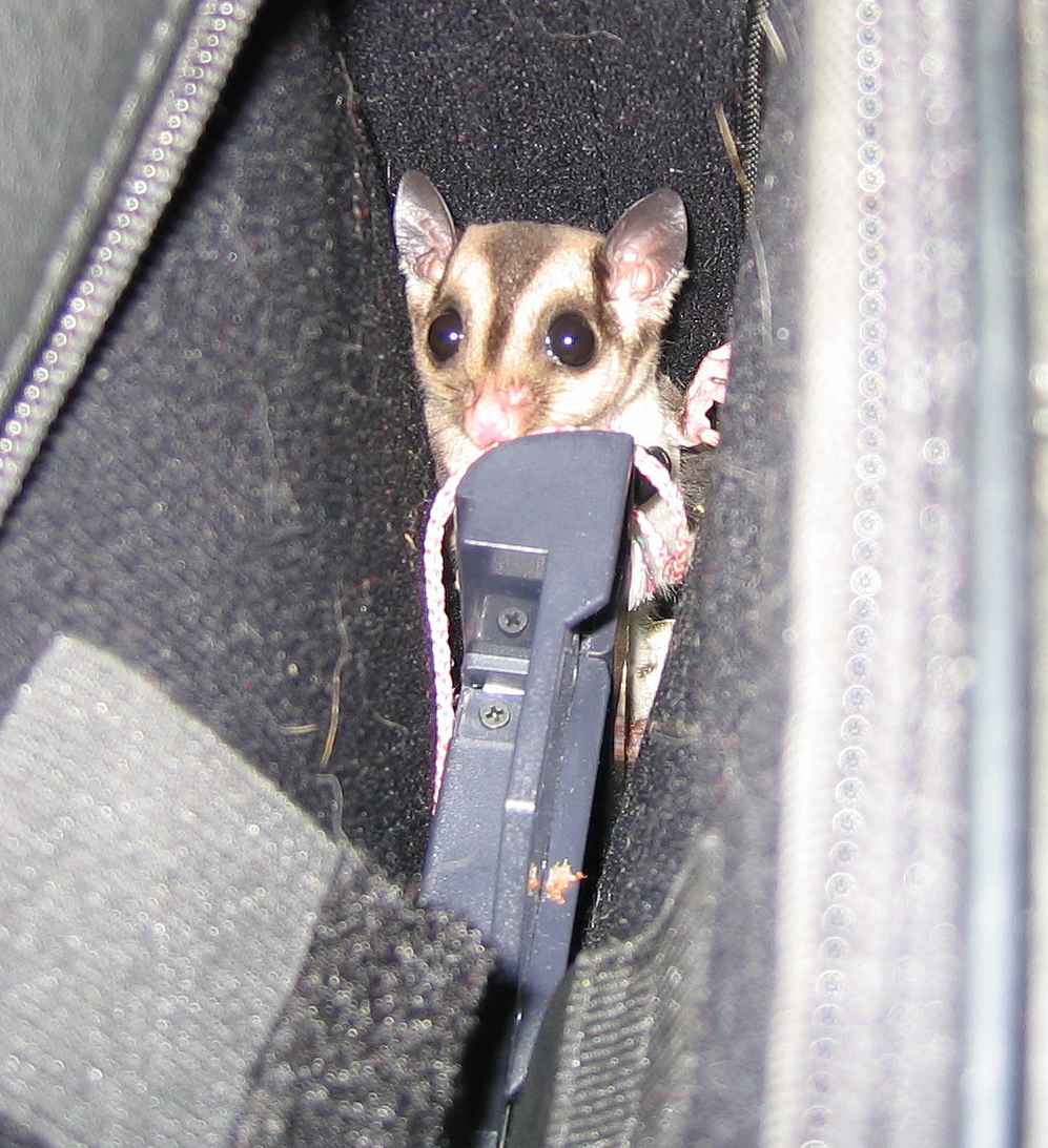 said Nyet! Five years later, wifey is gone and again I fell in love at first sight when I saw a breeder set up at a flea market. This time I brought Joy home. Joy is a female Glider that as of this date (08/09/05) is about 7 weeks old. She was hand-raised and therefore tamed to me almost instantly. I've owned rabbits and squirrels and other small critters. I've never seen a small one that bonded to its owner as fast as Joy did. Within a week of getting her, she would come to the door of her cage when I opened it and would sit on my shoulder or in my pocket for hours on end. Truly a pocket pet! Sugar Gliders are flying marsupials (have pouches like kangaroos) that are native to Australia. Even though the Glider looks like a rodent, it is a member of the Possum (not the same as the US O'possum) family. The young are born just a few days after conception and spend the rest of the gestation in a pouch in the mother's belly. The "sugar" refers to their almost insane love for anything sweet. In the wild they live in treetops and live on fruit, nectar, gum sap from trees, and occasionally smaller animals. A true omnivore. These little critters glide (fly) like the American Flying squirrel. It has a web of flesh that extends from its wrist to its ankles. It can glide for hundreds of feet, usually in pursuit of insect snacks. An interesting feature is that the Glider has opposable thumbs on all 4 "hands". They really do use their paws as hands. The rear feet grasp objects while the front are used to explore things and to hold food while eating. In captivity, their diet should consist of about 75% fruits and carbohydrates and 25% protein. I feed ordinary fruits from the grocery store, glider pellets and meal worms for protein. Gliders are prone to calcium deficiency so I water with a fruit juice/honey/water mix that contains Calcimate, a calcium fortifier designed to go in the water of reptiles. I also sprinkle a calcium supplement onto her dry food. Gliders have fantastic hearing and vision and use their gliding skills to home in on and eat flying insects such as moths. Their ears can be steered like a cat's which aids in homing in on the prey. Unlike bats, their sonar is passive and homes in on the beating of the insects' wings. Probably one of the best things about Gliders for the small apartment dweller is that they are almost odorless. Any waste odors indicate an improper diet. The urine has a faint fruity odor for a little while after discharge and then becomes odorless. The male gets a slight odor during mating season.. On the proper diet, the poop is dry and practically odor-free. I'm just starting my photo collection of Joy'isms so the initial album is short. Enjoy the following. Update March 06 I'm sad to say that I lost Joy shortly after the birth of her first baby. The only thing I can figure is that something went wrong during the gestation. Other Glider experts have suggested maybe a genetic defect that also caused the tiny underweight kit.