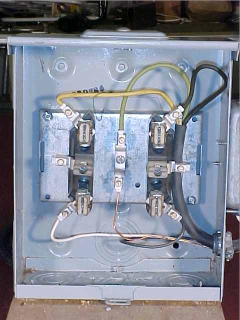 This photo shows the connection for 120vac operation. The astute will note that I'm metering both the hot and neutral leads. This nifty little trick allows me to use a 2 pole 240 volt meter (the most ubiquitous type) on 120 vac. The potential coil sees only half voltage but the current coils deliver two signals, one for the current going out and the other coming in. The two neatly compensate each other. I've verified this equivalence on my meter calibration bench. | ||||||||