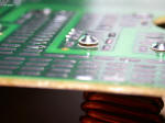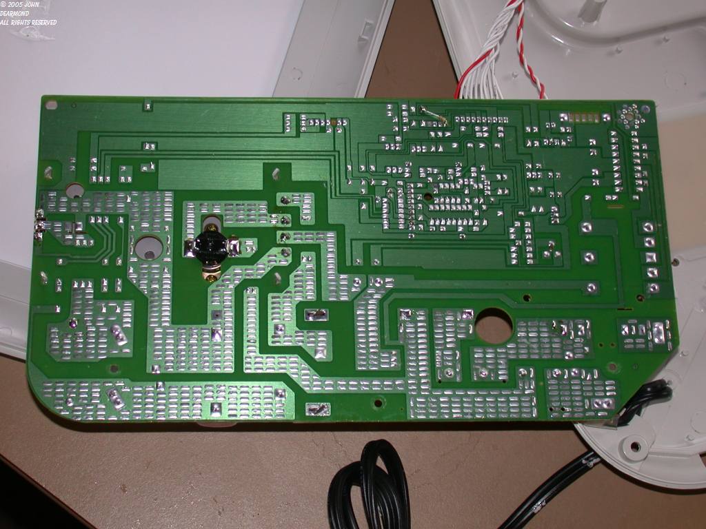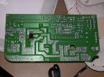 | The bottom of the main PCB. The numerous little solder blisters on the traces is a trick to increase the current carrying capacity of the trace without having to go to thicker copper foil. The black thing in the center-left is a Klixon thermostat to protect the power semiconductor. |