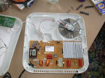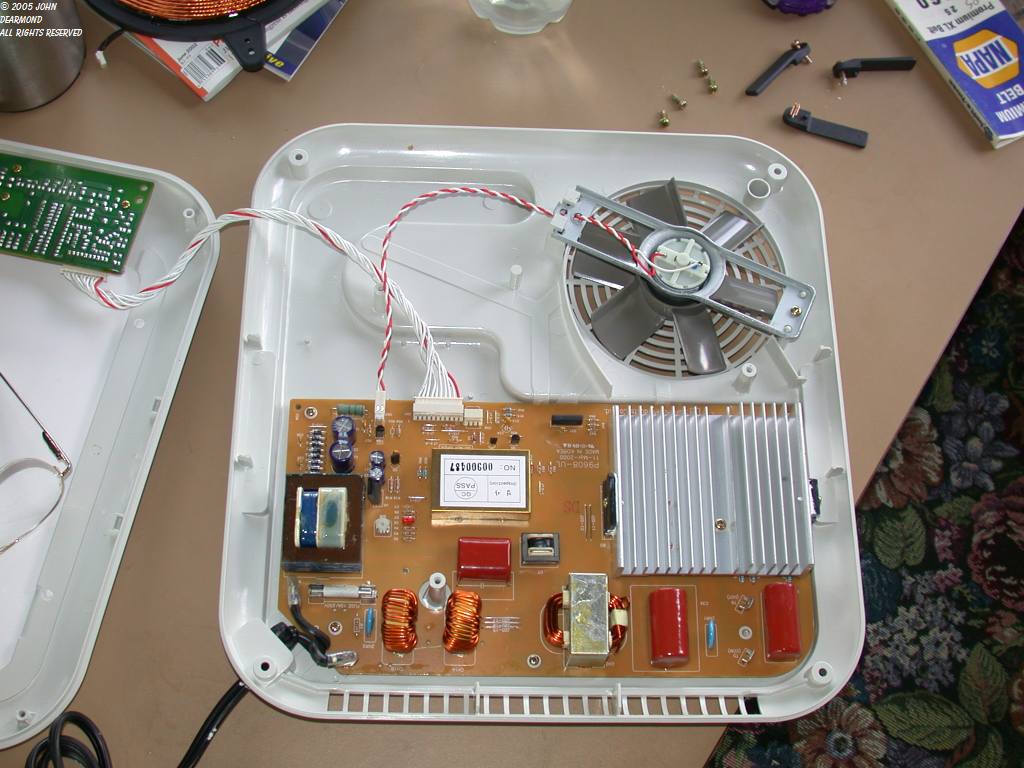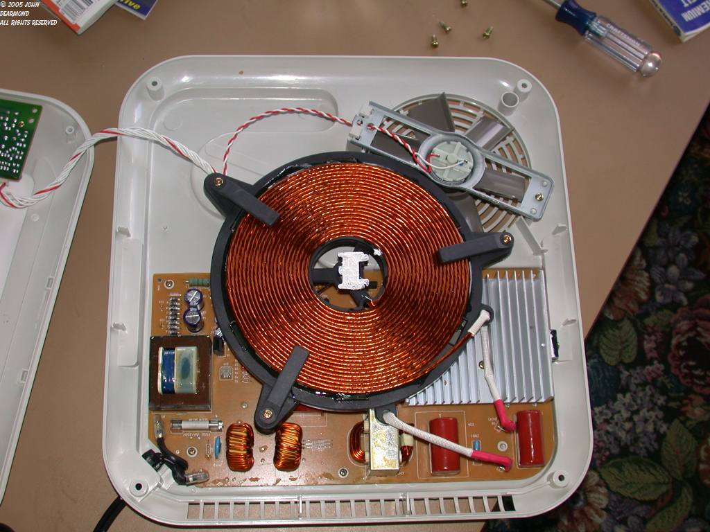of amps flow, very rapidly heating the pot and cooking the food. A thought immediately comes to mind - can an induction range be used or converted to a neon electrode induction heater? The answer is provisionally, yes. The range has the ability to tune itself to accommodate different size pots and pans. And it tries to protect itself from running unloaded by detecting the presence of the pot of appropriate metal (iron or steel, aluminum is too conductive) and turns itself off if there is no load (pot). Making the range work as an induction heater will revolve around controlling the power and fooling the protection and tuning circuits or bypassing it. My first experiment (sorry, no pictures) involved winding a coil similar to the primary one and placing it on top of the range. Heavy leads carry the current to the work coil of a few turns that loop around the neon electrode. This showed great promise, though the protection circuit was touchy. I played around with adding pieces of iron plate on top of the coil. That helped but the real solution will be to defeat the protection circuit. Meanwhile, enjoy some pictures of the internals of this one. This model was sold on QVC. This one and several of the others are warranty returns. All had the same problem - an inductor missed getting glued to the board and shipping vibration broke the solder joints. Their carelessness = my gain! I bought 'em in a box of misc junk at a flea market. As I recall, this unit runs at about 35khz, a perfect frequency for neon
