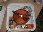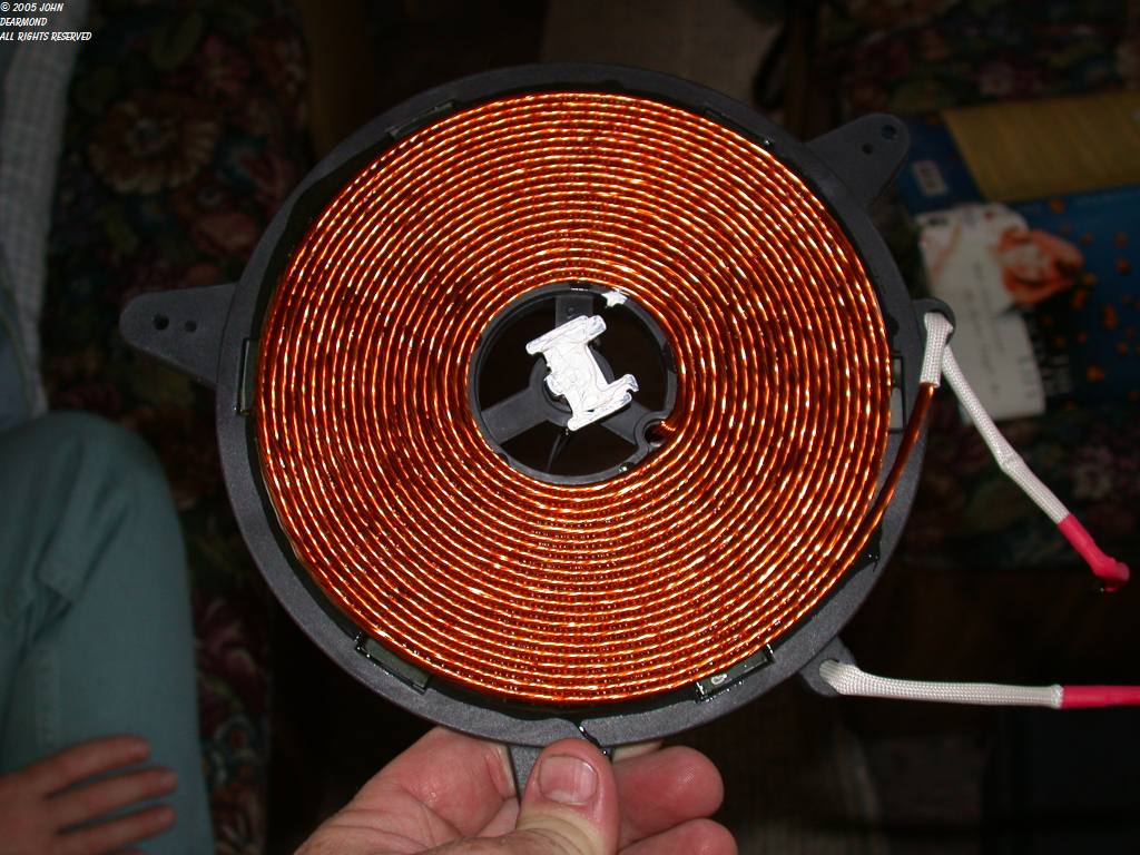 | A closeup of the primary coil. The Litz wire construction is plainly visible. The thing in the center with the white goo is a thermal sensor that turns the unit off if the ceramic plate gets too hot. |