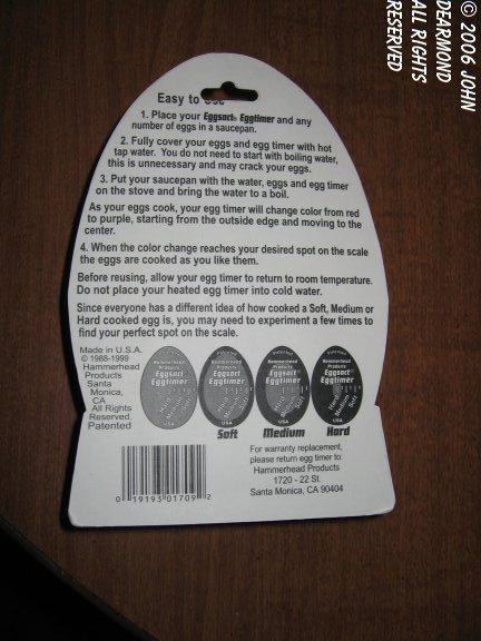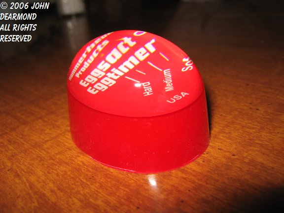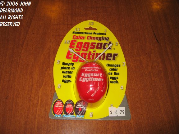 boiling eggs but it does it in a unique manner. It consists of two hunks of plastic with a color changing layer in between. This layer is red at room temperature. As it gets hot it turns black. Apparently the temperature where the color change occurs corresponds to the egg hardening temperature. |