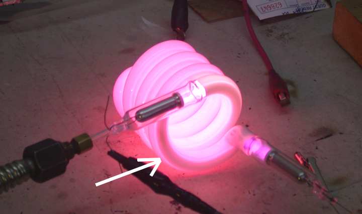 | In this photo we see the tube filled with about 4mm Hg of argon and illuminated at 60 ma. It is quite curious that the phosphor glows this gorgeous magenta even though the phosphor is a dull orange under a UV color checker. The arrow points to the thick layer of phosphor on the bottom of the tube. The light output is greatly reduced here. |
