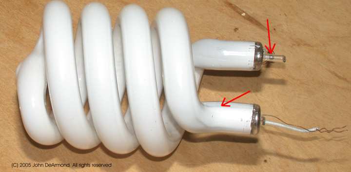 ![]() The candidate device is pictured to the left. This is the largest, brightest unit available as of this writing. The tube, liberated from its mount is shown above. The top arrow points to the mercury releasing device. I though it was a blob of mercury but a closer exam shows it to be a solid. The bottom arrow points to a thick buildup of phosphor. Sloppy. So thick that it impedes light production. |