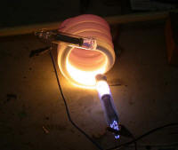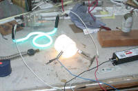 | In this photo I have just fired the mercury capsule contained in the Masonlite QuickSilver electrode. The mercury is just starting to migrate through the tube. It is evident here just how much the mercury contributes to the brightness of the tube. |
