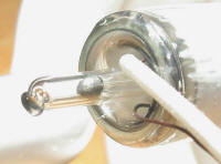 | Here I'm cutting off the existing electrodes with a Kitco hot wire tube cutter. I hold the switch on the Kitco until the wire loop reaches a dull red. Then I remove it and touch a wet finger to the glass. It parts at the heated line. Like magic. |