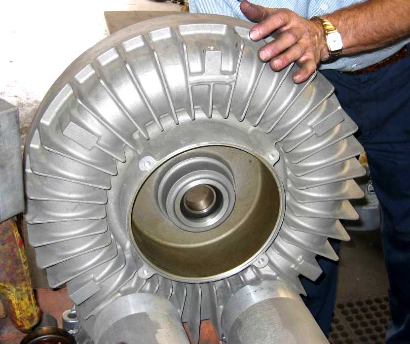 | The diffuser housing. The air enters one port, travels around the periphery where the rotor imparts velocity and then exits the other diffuser port, converting velocity to pressure. Caution: The shapes are very important. Do not try to improve the blower performance by changing the shape of the ports |