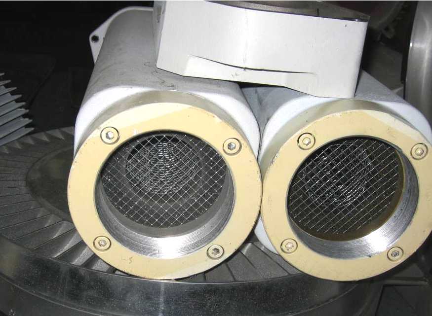 | Mufflers. Maintenance of these mufflers is essential to controlling noise. The fibers in the mufflers become packed and broken from the intense sound levels. Replacing the muffler internals is a routine maintenance task. |