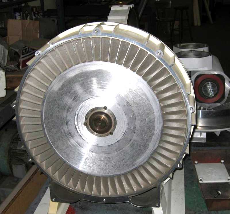 Electric Motor Service. I took some photos along the way. Caution: Regenerative blowers operate with very tight tolerances. The rotor runs at a very high velocity. Ergo, the unit tolerates very little abuse. If you decide to disassemble your blower, do not beat or pry on the housing if you expect the rotor to not drag afterward. Even a tiny opening in rotor-diffuser clearance will cause a dramatic decrease in performance. The most common repair is damage caused by bearings wearing out. The rotor-diffuser clearance is so tight that a bearing does not have to fail catastrophically to cause rotor-diffuser contact. Even slight scuffing of the diffuser face, damage to the rotor blades or warpage of the rotor will dramatically reduce the unit's performance. Therefore do not wait until the bearings fail completely. Take the unit out of service and replace the bearings at the first sound of roughness. Jerry's has the special tools that make taking the machine apart easy and