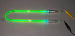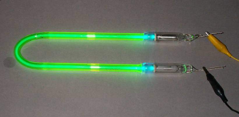 This is a not-too-great photo of Uranium glass tubing. This kind of glass contains a little (1-3%) uranium metal as colorant. It makes a glass that is yellowish in normal light but fluoresces lemon yellow under ultraviolet light. This is essentially the same glass as Vaseline antique glass. When stimulated by the UV from argon/mercury as in this photo, the yellow fluorescence mixes with the bluish light from the merc and makes this greenish-yellow color. The two yellow dots on the middle of each side are artifacts from the cheap digital camera I was using at the time. Also visible in this photo is the intense blue fluorescence that normal clear lead glass produces when stimulated with UV. The clear electrode housings are leaded glass. |