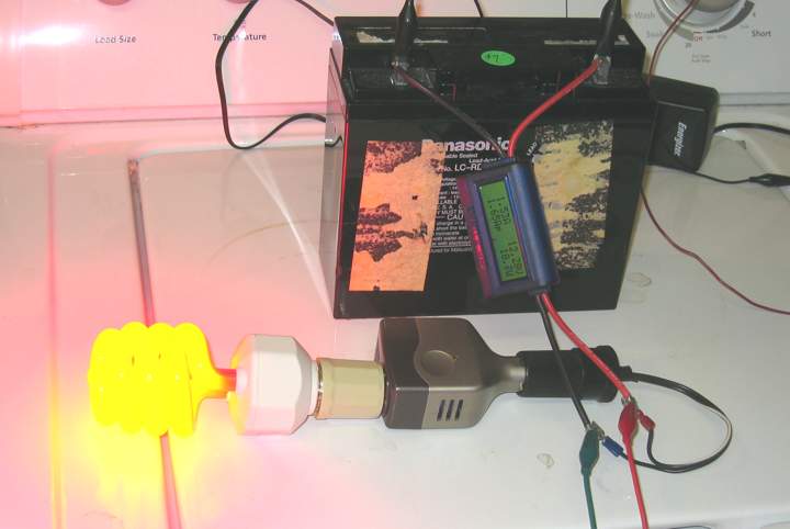 some measurements. In the photo at left you see: Before connecting the CFL to the inverter, I tested it on line voltage using a Kill-a-Watt power analyzer to record its electrical characteristics. They are as follows: