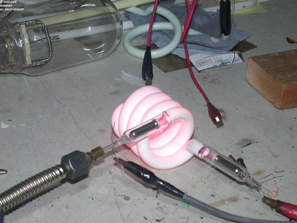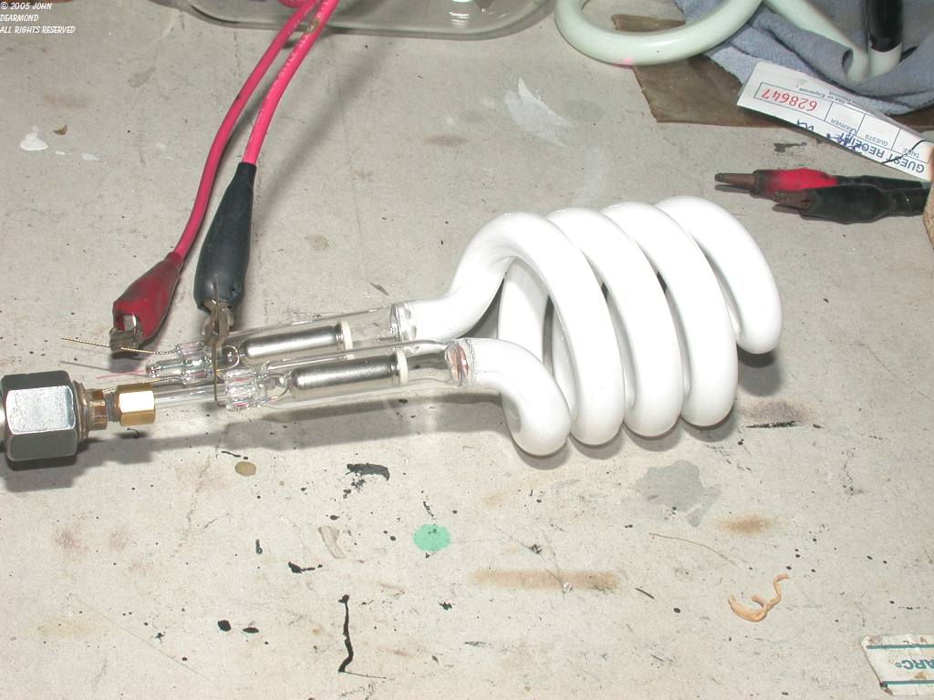 (not pictured) - Before applying the epoxy to the compression fitting ferrule, the fitting is taken apart, the end with the ferrule is held up, the assembly is gently heated and epoxy is dribbled in to fill the space between the capillary tube and the 3/16" tubing. Capillary action is allowed to make a nice round meniscus at the end of the larger tubing. This eliminates a lot of gas dead space that could trap impurities. After the epoxy is cured, the ferrule is coated with more epoxy and the nut tightened. Neon End of the Capillary/Stinger setupUnfortunately I don't have any good photos of the part that attaches to the tubulation glass. These two photos are the best that I can come up with