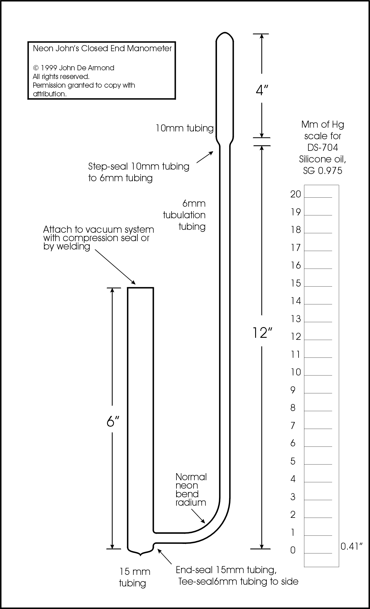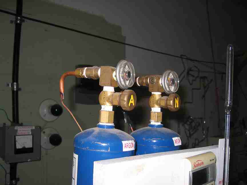 You can see several features. Starting at the top are the two 20 liter disposable tanks of noble gas from Spectra Gas. These guys are a dream to deal with, will sell to individuals, accept plastic and are about half the price of "neon suppliers". The tanks, which look like propane tanks, come with a CGA-580 connector but I removed that big bulky thing and connected directly to the instrument valve on the tank. Actually I use these 20 liter tanks as my "day tanks" and refill them when empty from 200 liter tanks, also purchased from Spectra. The gas is cheaper that way. More importantly, if I make a mistake like opening a gas cock into the vacuum system, I only waste 20 liters or less instead of a large 200 liter tank. Don't laugh, it happens. This is a close-up of the tank assembly. The tanks come equipped with those nice instrumentation needle valves, the 90 deg elbow and a female CGA-580 fitting. I drilled and tapped the elbows for the little pressure gauges. Since that photo was taken, I replaced all the teflon tape downstream of the needle valve with epoxy. The brass compression fitting has to be loosened to refill the tanks so I coat the ferrules with silicone vacuum grease instead of epoxy. Proceeding down the photo, on the right is the closed end manometer. This type of manometer is VASTLY superior to U-tube manometers in that no valve is involved, it is impossible to suck the fluid out and minor zeroing is accomplished by sliding the scale. The system as pictured is under full vacuum and the gauge is zeroed. It is designed to use common DC-704 silicone diffusion pump oil.