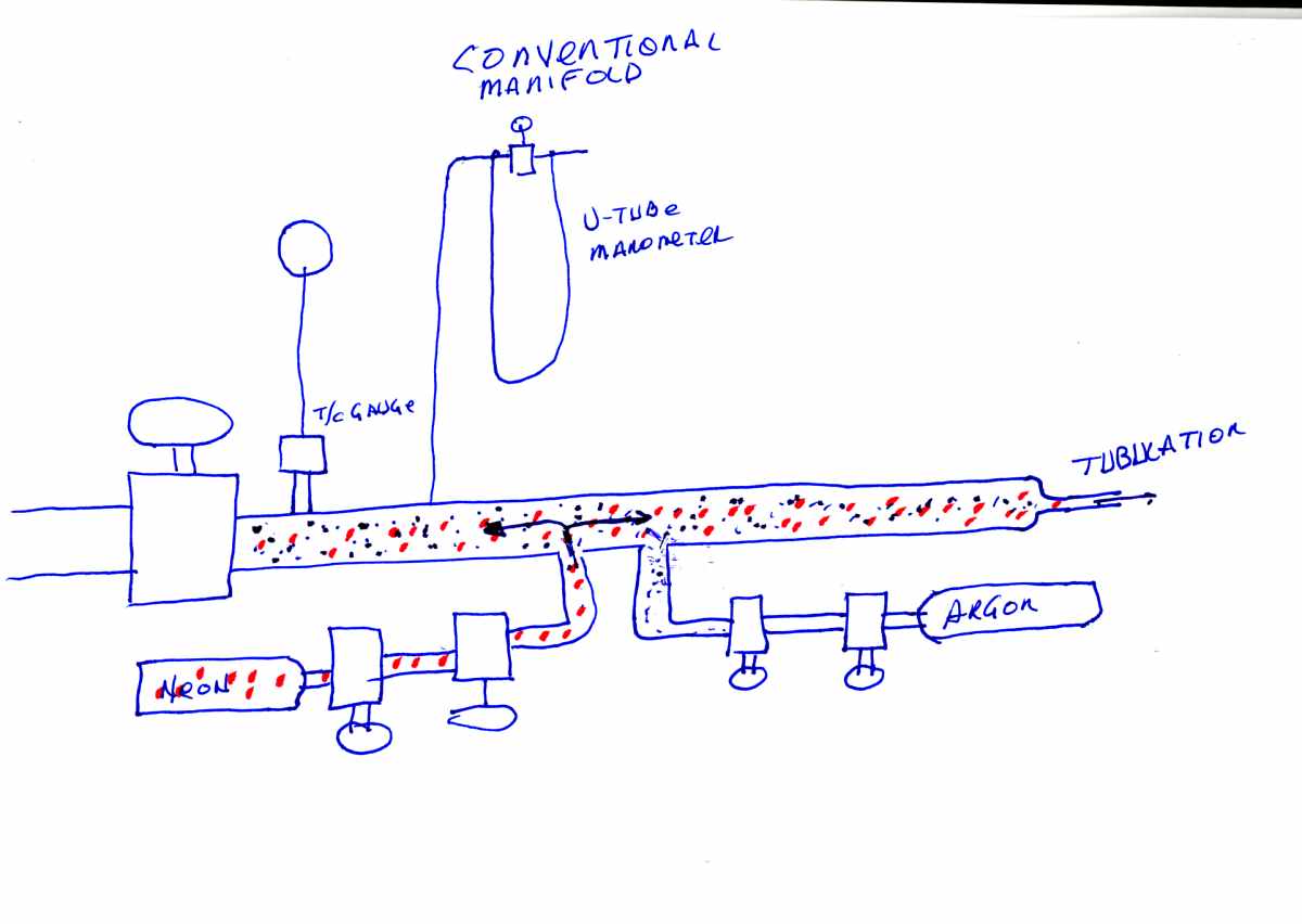 With a good vacuum system, the gas in the unit is so pure that a red tube goes pure red in a tiny fraction of a second after being energized. Usually that little kick of the bombarder that most guys give a filled tube to ensure the tube works is enough to bring the tube up to color. A tiny bit of off-color usually remains at the far end - after all, the impurities that remained in the unit itself are still there but have been swept to the far end - but that cleans up in seconds. Even with a poor vacuum system such as one without a secondary pump (diffusion, turbo, etc), and with a mechanical pump capable of no more than 8 or 10 microns, the unit STILL comes up to color in seconds. (I am NOT advocating not using a secondary pump. This statement is strictly for illustration.) This type of gas admittance is commonly used in other industries but to my knowledge and research, has never been used with neon or other illuminating tube. I researched it extensively with the notion of applying for a patent. I don't really like patents so with this web page I contribute this invention to the public domain. The Overall Picture
