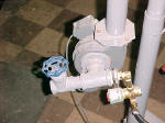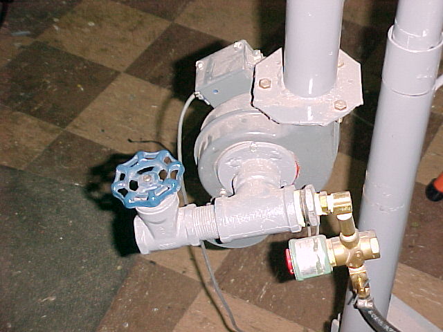 enough that they fell over the opening. I chose to mix the gas and air before the blower for a reason. The spinning blower wheel makes an excellent gas mixer. This ensures a very uniform mixture to the burner screen. Note that I have 2 psi gas service in my shop. If I had low pressure service I'd have needed a larger solenoid valve, needle valve and hose. |
