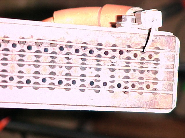 the metal red hot with a torch before bending. The screen shows several features. The velocity of the mixture though the screen holes must exceed the combustion speed or else the flame will back down the hole and cause a flashback. After laying out the screen with the correct size holes I realized that I'd have hundreds of holes to drill. I came up with a clever method of cutting those in half. I drilled larger holes, then cut grooves through the centerline, then placed and staked stainless steel wire. This wire effectively makes two holes out of one, increases the velocity and prevents flashbacks. |