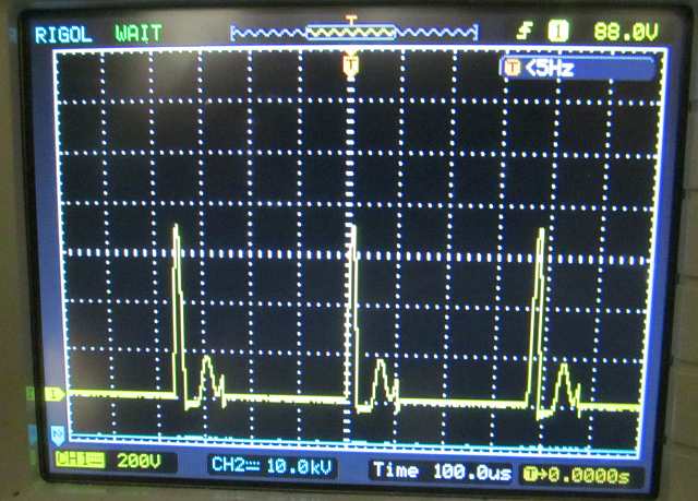 This is the DR35 waveform operating with the corona dummy load. Significantly cleaner than the DR37T. One thing I did notice was that the flyback pulse height did not vary much with input amps variations. It was acting more like transformer than an induction coil. |